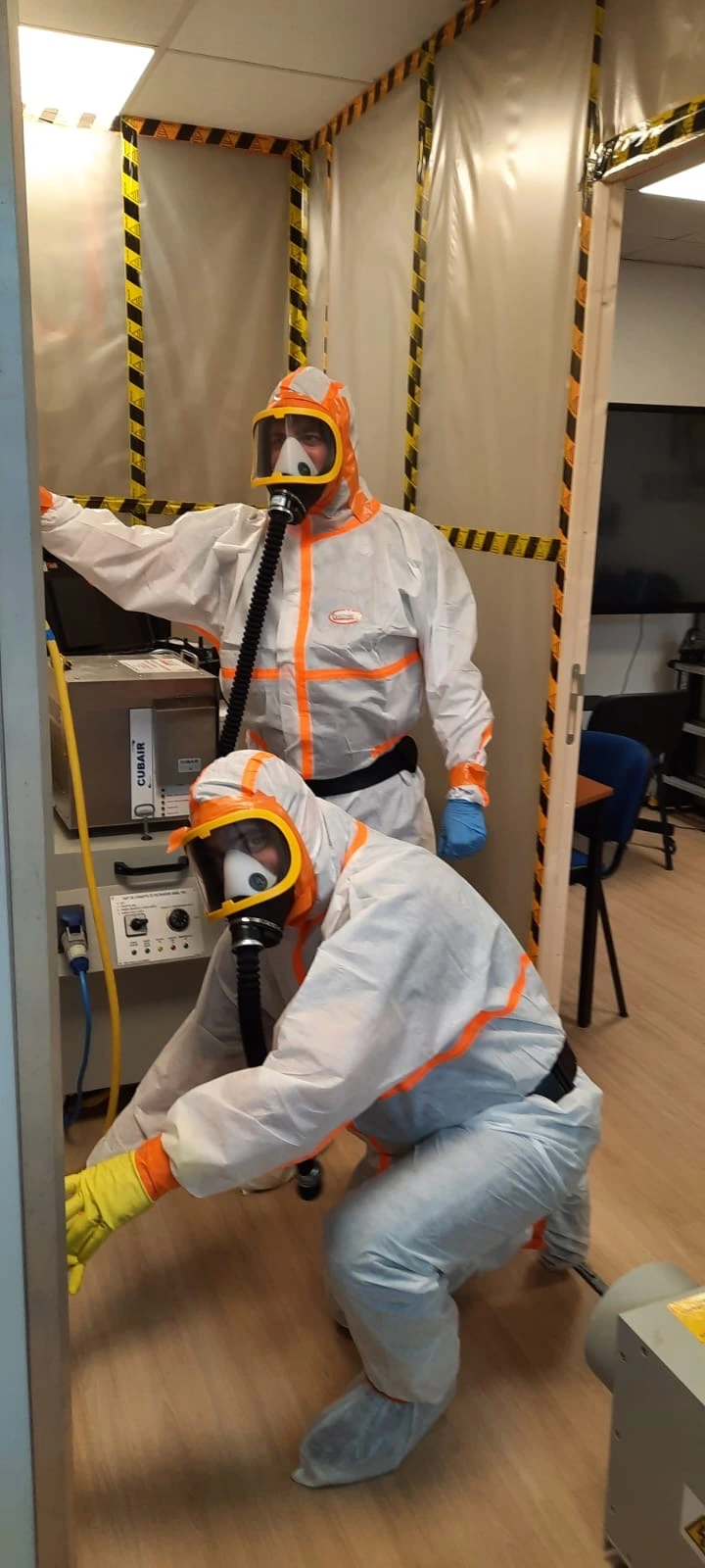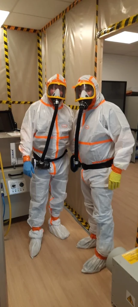 Lorsque des matériaux suspects sont identifiés, des échantillons sont prélevés en toute sécurité, dans le respect des normes de protection.